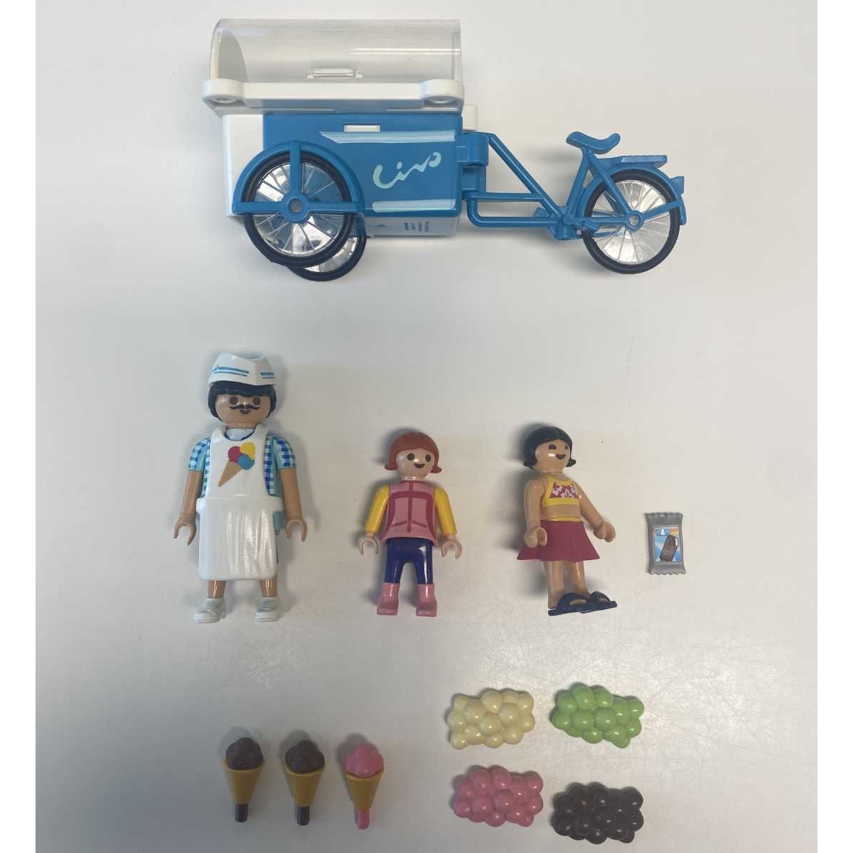 1 fiets met ijskar, 3 ijsjes, 4 gekleurde hoopjes ijs, 1 ijscoman (met pet en schort), 1 meisje, 1 meisje met sandalen en rokje, 1 ingepakte frisco